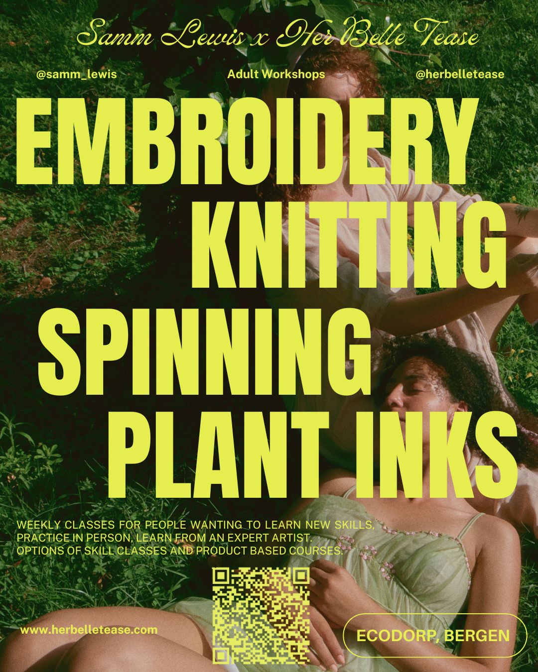 Join artist Samm Lewis in Bergen for sustainable textile workshops in embroidery, knitting, spinning & plant inks. Classes every Wednesday from Nov 5th.